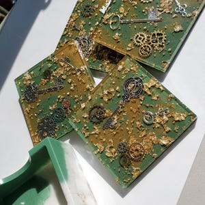 Gold Leaf Resin Coaster Set: Steampunk Style Sage Green and Honey