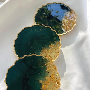 Emerald Green Gold Leaf Resin Coaster Set – Handmade Epoxy Drink Coasters